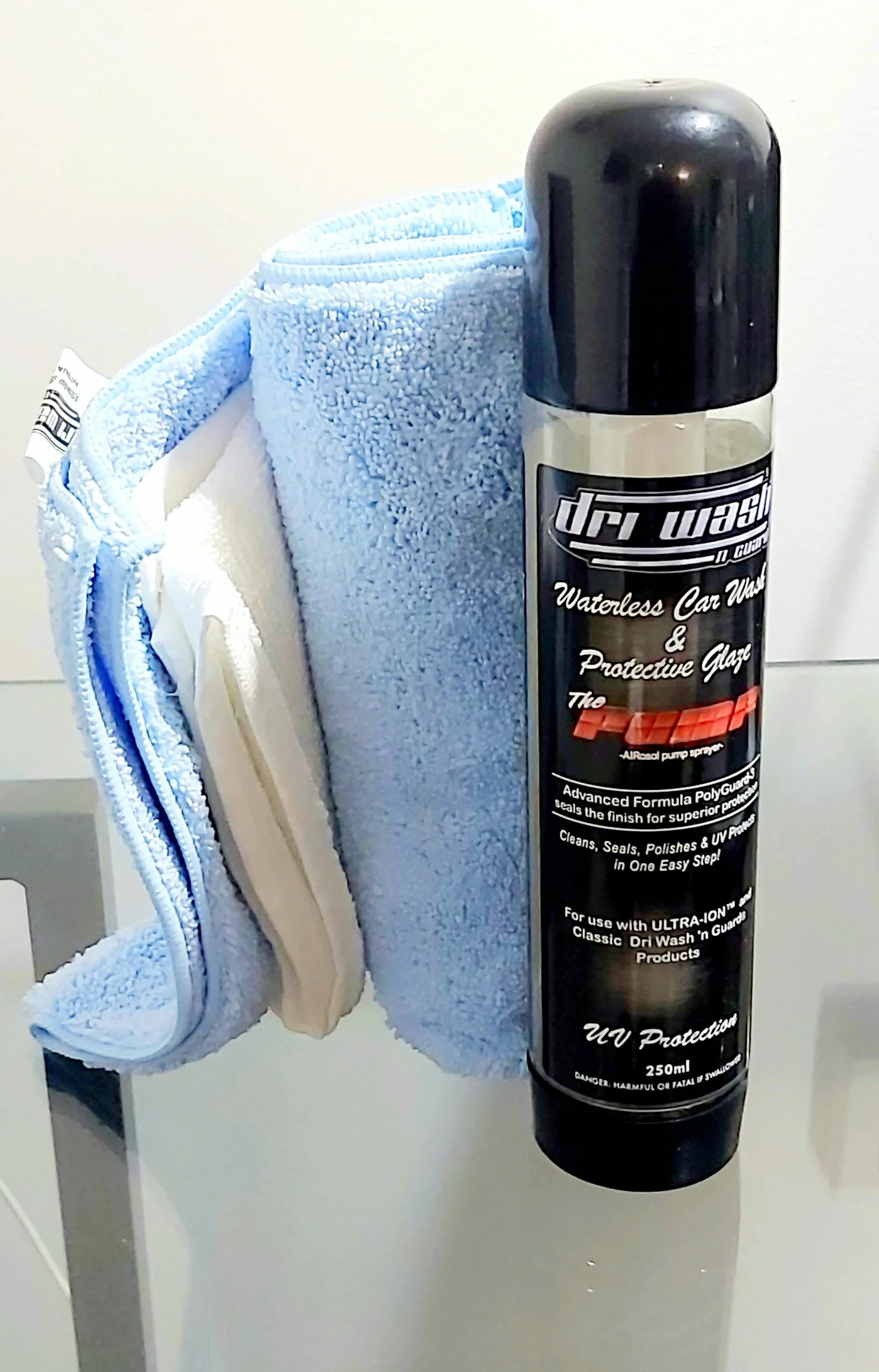 DRI WASH 'n GUARD® ULTRA-ION™ WATERLESS CARWASH™ is the latest generation of waterless car wash from DRI WASH 'n GUARD®, setting the benchmark worldwide in waterless car wash technology. It is specifically designed for the sensitive 21st-century paints used on cars manufactured since the year 2000, but it is just as effective on any paint no matter its age. Ionic Technology helps repel dust from your vehicle's surface, and the exclusive PolyGuard-3™ formula helps make existing minor feather scratching less noticeable as you apply the product by hand or if you buff the painted surfaces.